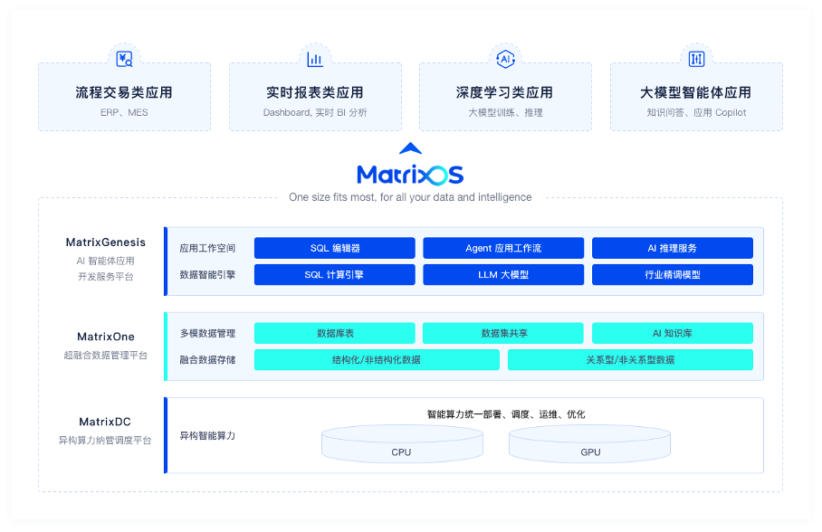 MatrixOS 秉承,更是对整个手艺社区的一次诚挚邀请。内置强大的异构数据存储及加工平台,基于无形态容器化的计较层能够使得它快速弹性扩缩容以应对各类负载的波动。MatrixGenesis 开辟平台是专为 AI 开辟者设想的,开辟者能够基于 MatrixOne 快速的一坐式的打制营业系统和数据阐发使用,